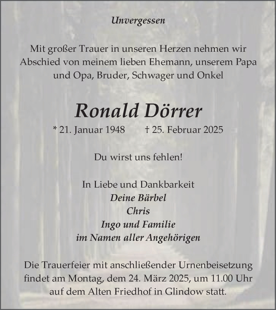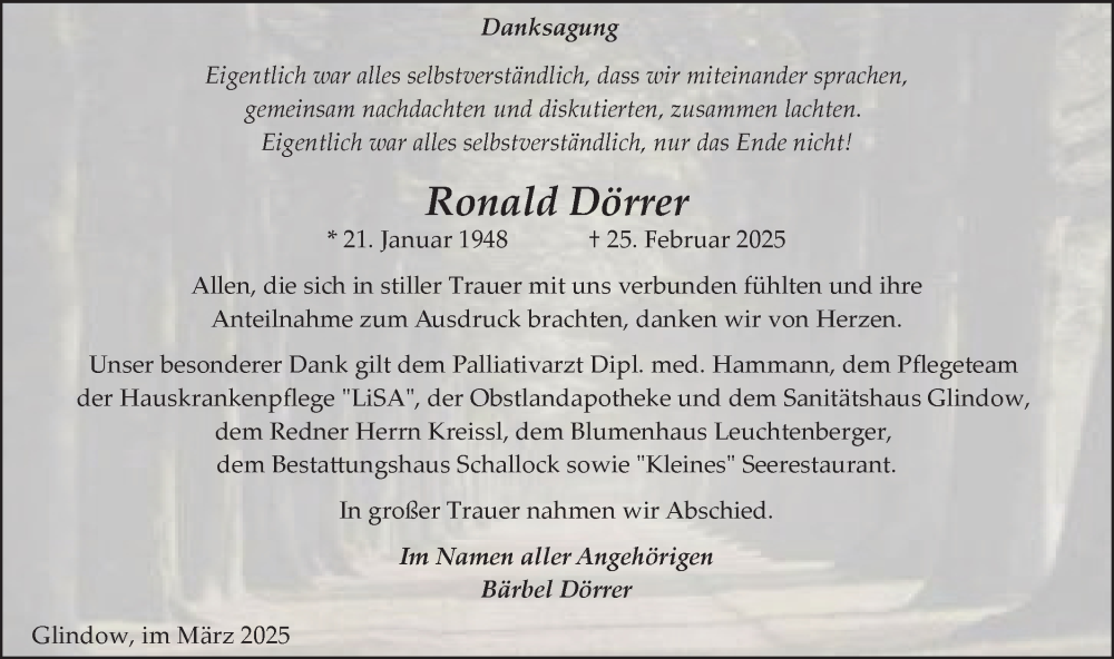 Hier finden Sie alle Traueranzeigen aus der Zeitung, die bisher für Ronald Dörrer erschienen sind. Weitere Traueranzeigen, die in der Zeitung erscheinen, werden hier ebenfalls aufgelistet