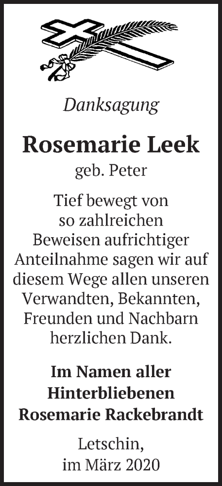 Hier finden Sie alle Traueranzeigen aus der Zeitung, die bisher für Rosemarie Leek erschienen sind. Weitere Traueranzeigen, die in der Zeitung erscheinen, werden hier ebenfalls aufgelistet