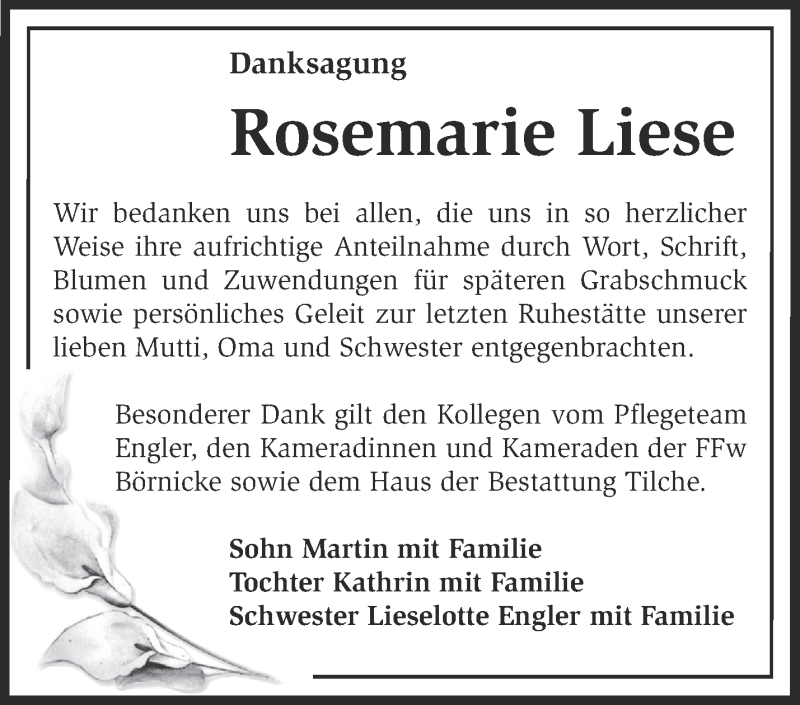 Hier finden Sie alle Traueranzeigen aus der Zeitung, die bisher für Rosemarie Liese erschienen sind. Weitere Traueranzeigen, die in der Zeitung erscheinen, werden hier ebenfalls aufgelistet