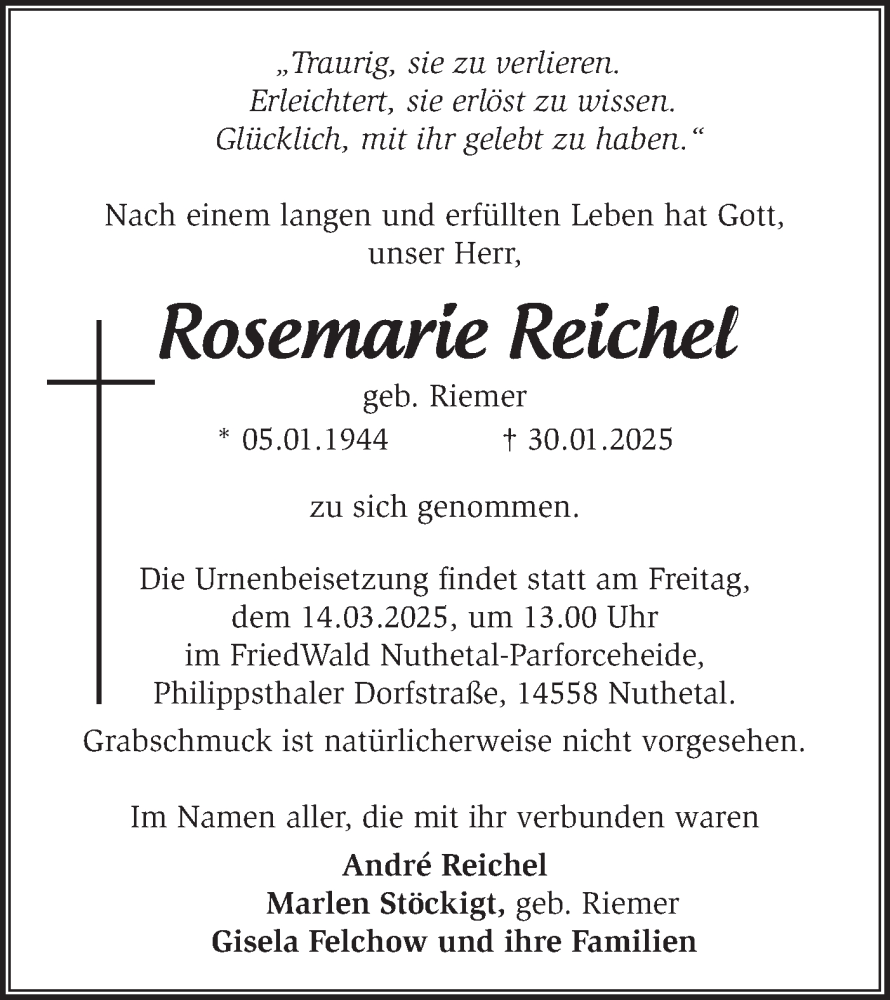 Hier finden Sie alle Traueranzeigen aus der Zeitung, die bisher für Rosemarie Reichel erschienen sind. Weitere Traueranzeigen, die in der Zeitung erscheinen, werden hier ebenfalls aufgelistet