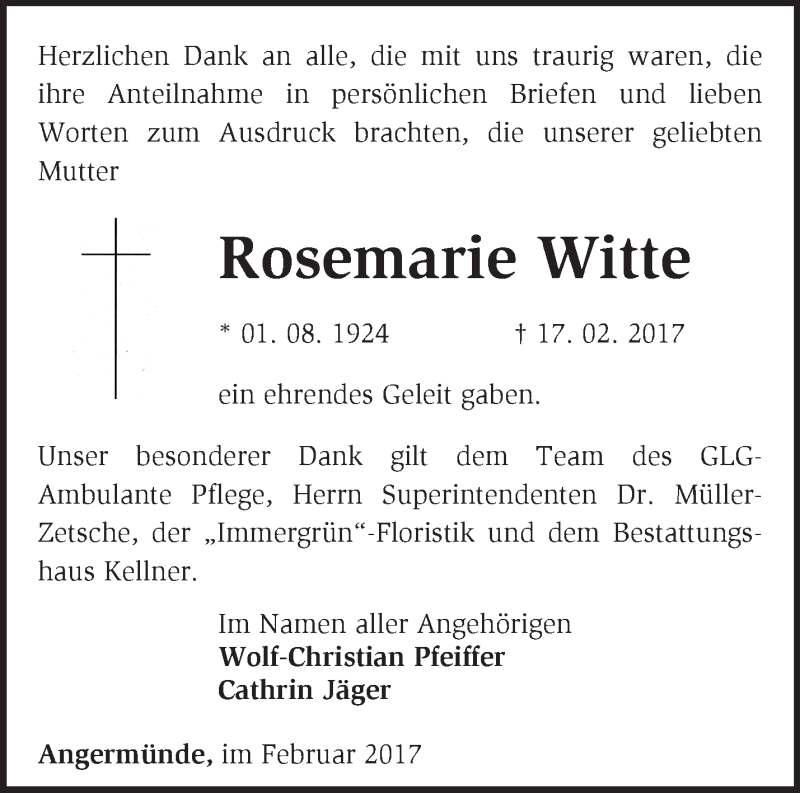 Hier finden Sie alle Traueranzeigen aus der Zeitung, die bisher für Rosemarie Witte erschienen sind. Weitere Traueranzeigen, die in der Zeitung erscheinen, werden hier ebenfalls aufgelistet
