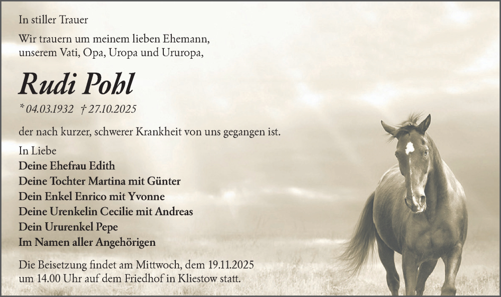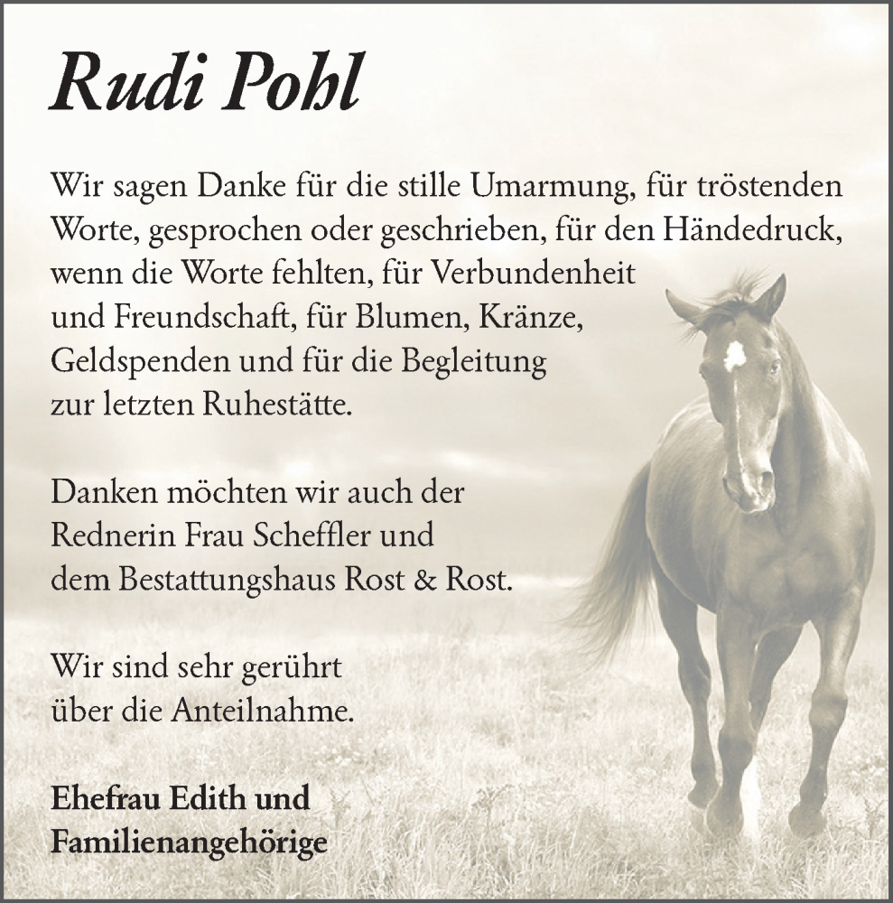 Hier finden Sie alle Traueranzeigen aus der Zeitung, die bisher für Rudi Pohl erschienen sind. Weitere Traueranzeigen, die in der Zeitung erscheinen, werden hier ebenfalls aufgelistet