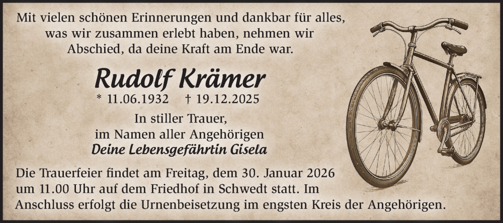 Hier finden Sie alle Traueranzeigen aus der Zeitung, die bisher für Rudolf Krämer erschienen sind. Weitere Traueranzeigen, die in der Zeitung erscheinen, werden hier ebenfalls aufgelistet