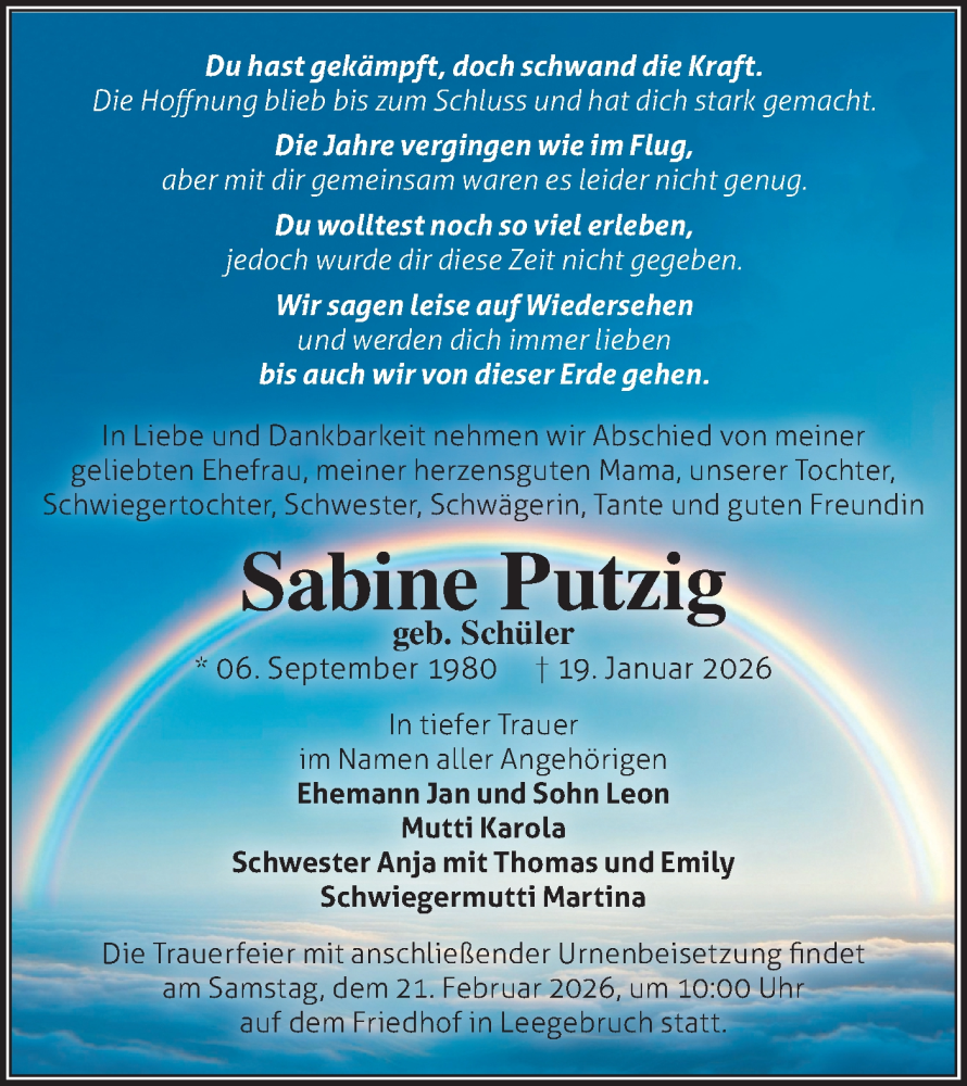 Hier finden Sie alle Traueranzeigen aus der Zeitung, die bisher für Sabine Putzig erschienen sind. Weitere Traueranzeigen, die in der Zeitung erscheinen, werden hier ebenfalls aufgelistet