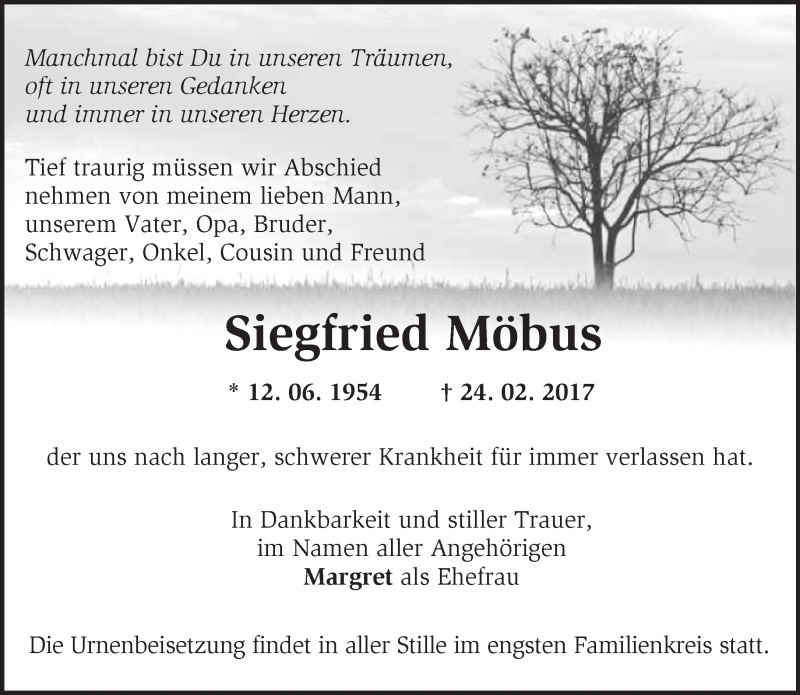 Hier finden Sie alle Traueranzeigen aus der Zeitung, die bisher für Siegfried Möbus erschienen sind. Weitere Traueranzeigen, die in der Zeitung erscheinen, werden hier ebenfalls aufgelistet
