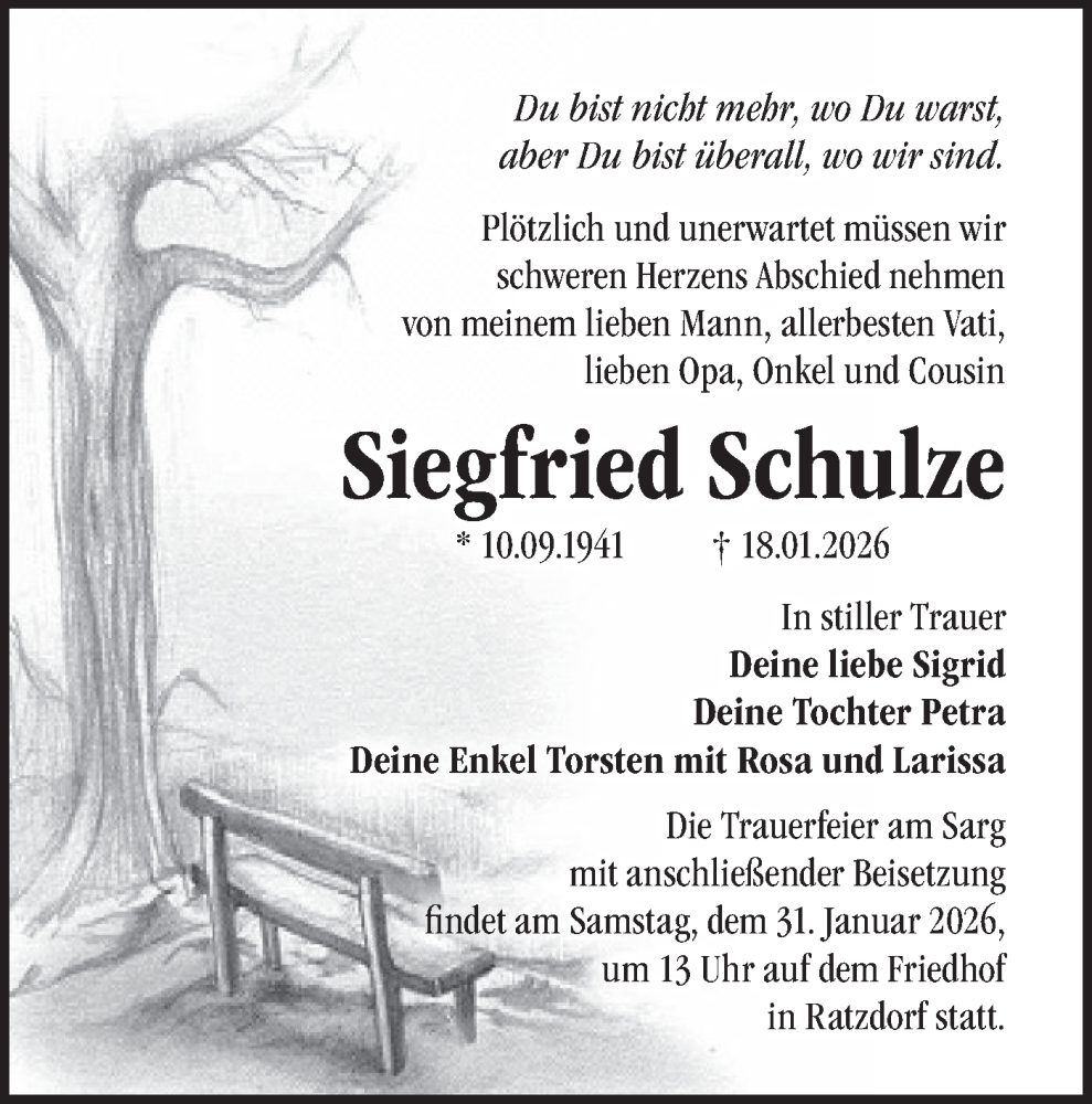 Hier finden Sie alle Traueranzeigen aus der Zeitung, die bisher für Siegfried Schulze erschienen sind. Weitere Traueranzeigen, die in der Zeitung erscheinen, werden hier ebenfalls aufgelistet
