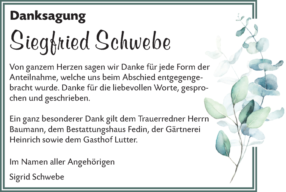 Hier finden Sie alle Traueranzeigen aus der Zeitung, die bisher für Siegfried Schwebe erschienen sind. Weitere Traueranzeigen, die in der Zeitung erscheinen, werden hier ebenfalls aufgelistet