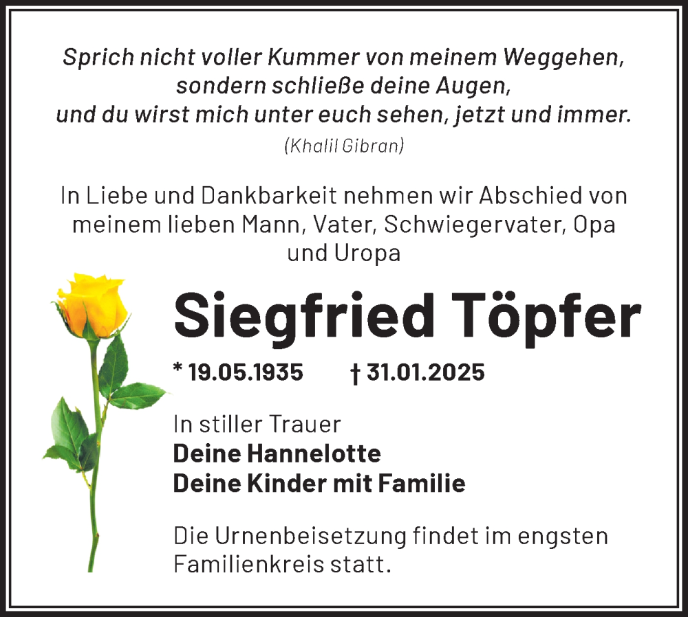 Hier finden Sie alle Traueranzeigen aus der Zeitung, die bisher für Siegfried Töpfer erschienen sind. Weitere Traueranzeigen, die in der Zeitung erscheinen, werden hier ebenfalls aufgelistet