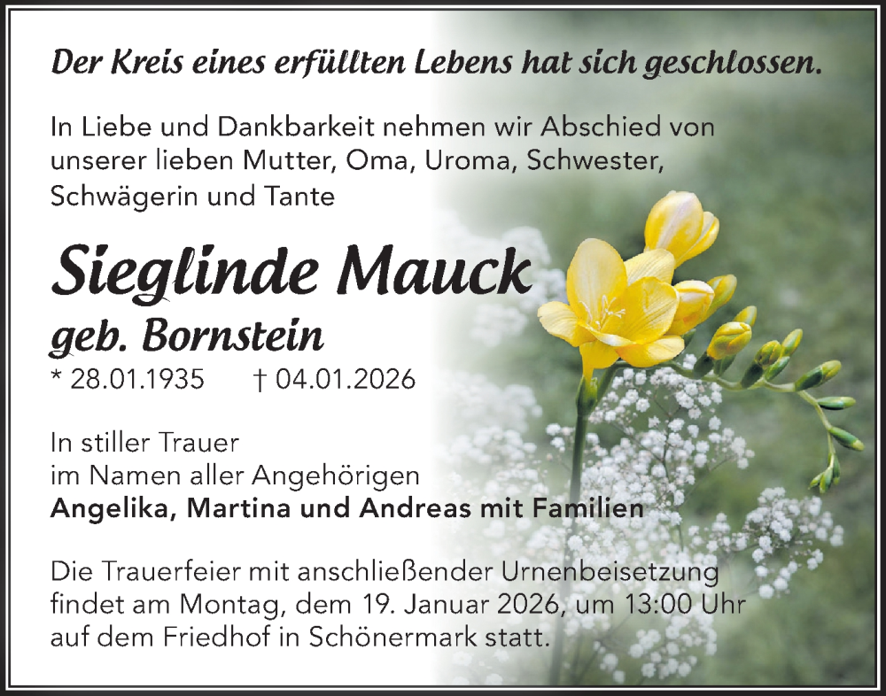 Hier finden Sie alle Traueranzeigen aus der Zeitung, die bisher für Sieglinde Mauck erschienen sind. Weitere Traueranzeigen, die in der Zeitung erscheinen, werden hier ebenfalls aufgelistet
