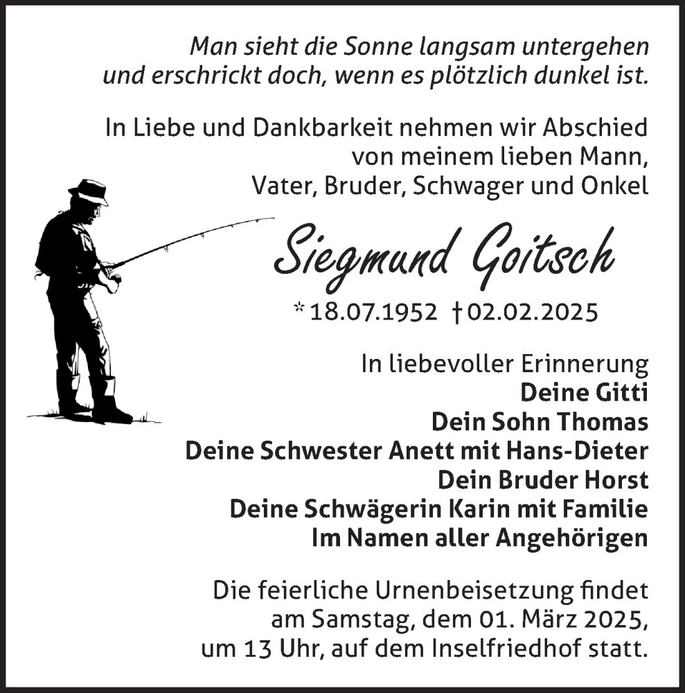 Hier finden Sie alle Traueranzeigen aus der Zeitung, die bisher für Siegmund Goitsch erschienen sind. Weitere Traueranzeigen, die in der Zeitung erscheinen, werden hier ebenfalls aufgelistet