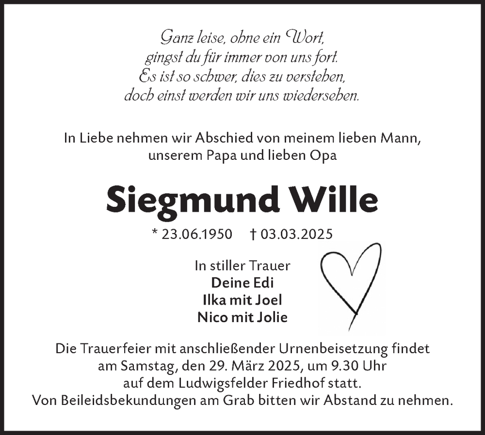Hier finden Sie alle Traueranzeigen aus der Zeitung, die bisher für Siegmund Wille erschienen sind. Weitere Traueranzeigen, die in der Zeitung erscheinen, werden hier ebenfalls aufgelistet