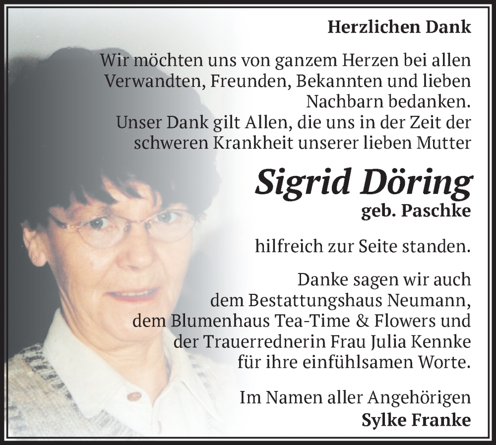 Hier finden Sie alle Traueranzeigen aus der Zeitung, die bisher für Sigrid Döring erschienen sind. Weitere Traueranzeigen, die in der Zeitung erscheinen, werden hier ebenfalls aufgelistet