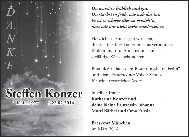 Hier finden Sie alle Traueranzeigen aus der Zeitung, die bisher für Steffen Konzer erschienen sind. Weitere Traueranzeigen, die in der Zeitung erscheinen, werden hier ebenfalls aufgelistet