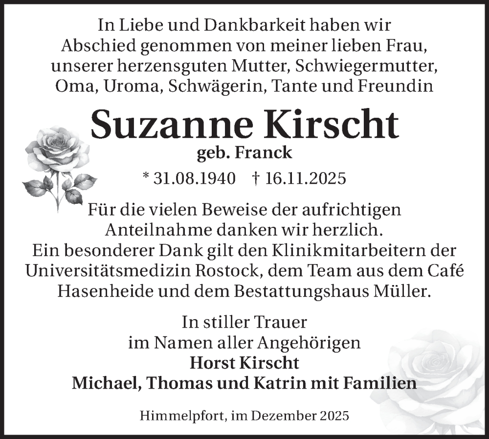 Hier finden Sie alle Traueranzeigen aus der Zeitung, die bisher für Suzanne Kirscht erschienen sind. Weitere Traueranzeigen, die in der Zeitung erscheinen, werden hier ebenfalls aufgelistet