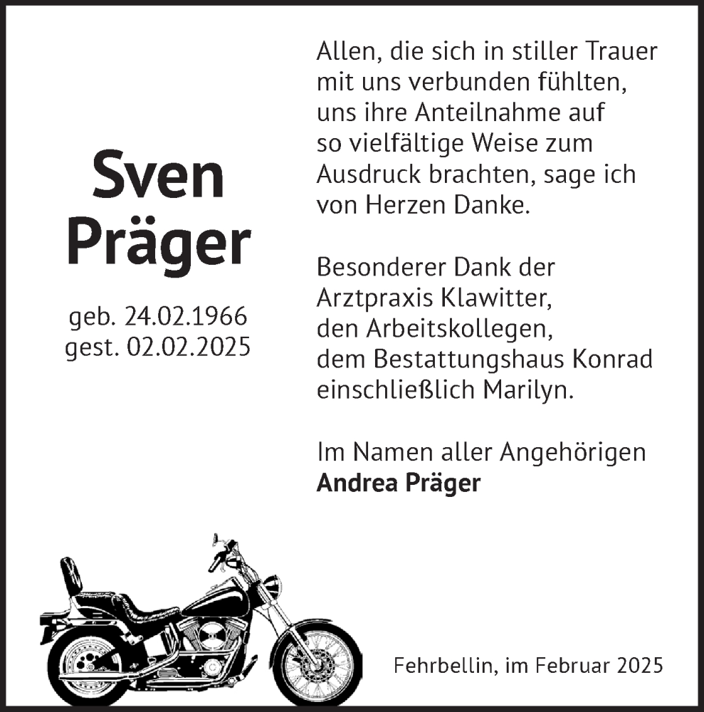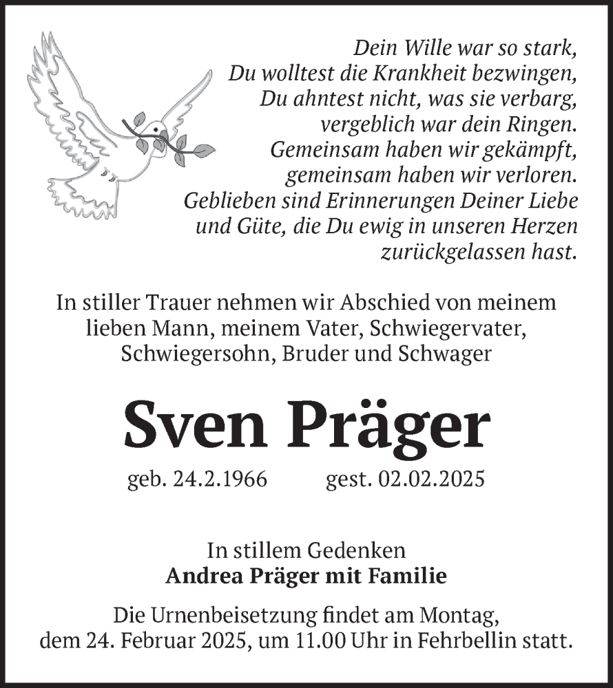 Hier finden Sie alle Traueranzeigen aus der Zeitung, die bisher für Sven Präger erschienen sind. Weitere Traueranzeigen, die in der Zeitung erscheinen, werden hier ebenfalls aufgelistet