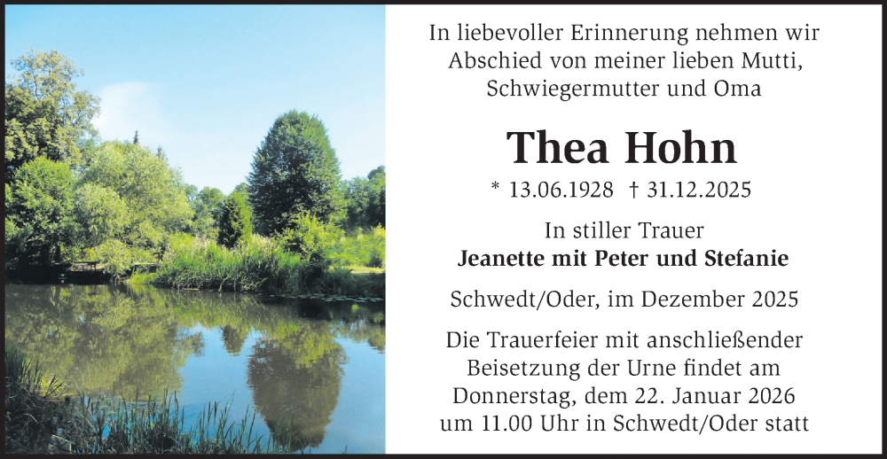 Hier finden Sie alle Traueranzeigen aus der Zeitung, die bisher für Thea Hohn erschienen sind. Weitere Traueranzeigen, die in der Zeitung erscheinen, werden hier ebenfalls aufgelistet