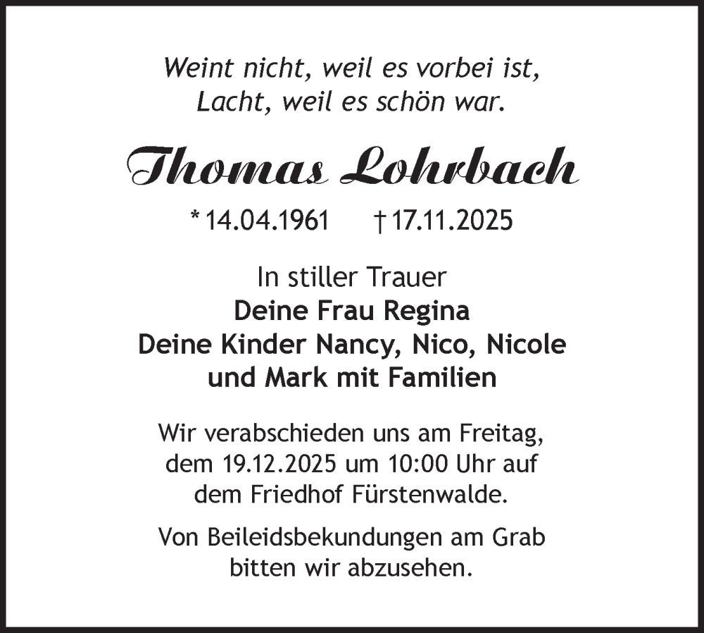 Hier finden Sie alle Traueranzeigen aus der Zeitung, die bisher für Thomas Lohrbach erschienen sind. Weitere Traueranzeigen, die in der Zeitung erscheinen, werden hier ebenfalls aufgelistet