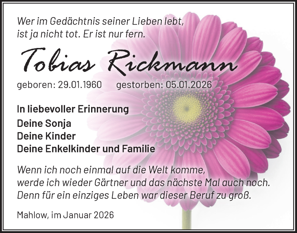 Hier finden Sie alle Traueranzeigen aus der Zeitung, die bisher für Tobias Rickmann erschienen sind. Weitere Traueranzeigen, die in der Zeitung erscheinen, werden hier ebenfalls aufgelistet