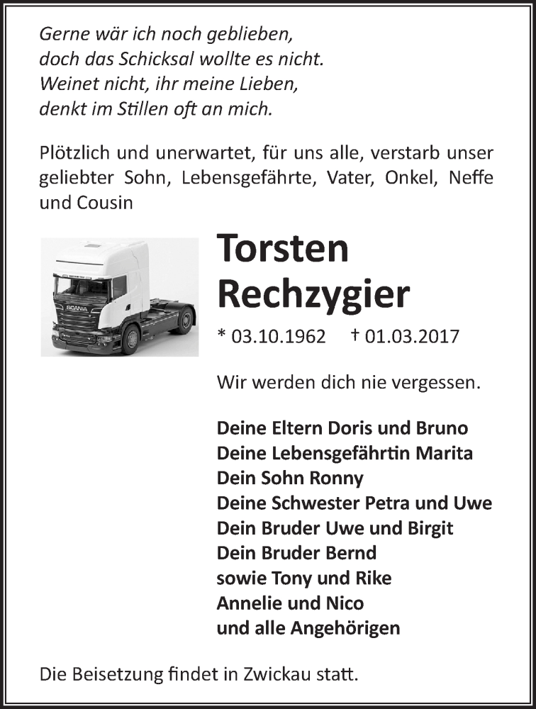 Hier finden Sie alle Traueranzeigen aus der Zeitung, die bisher für Torsten Rechzygier erschienen sind. Weitere Traueranzeigen, die in der Zeitung erscheinen, werden hier ebenfalls aufgelistet