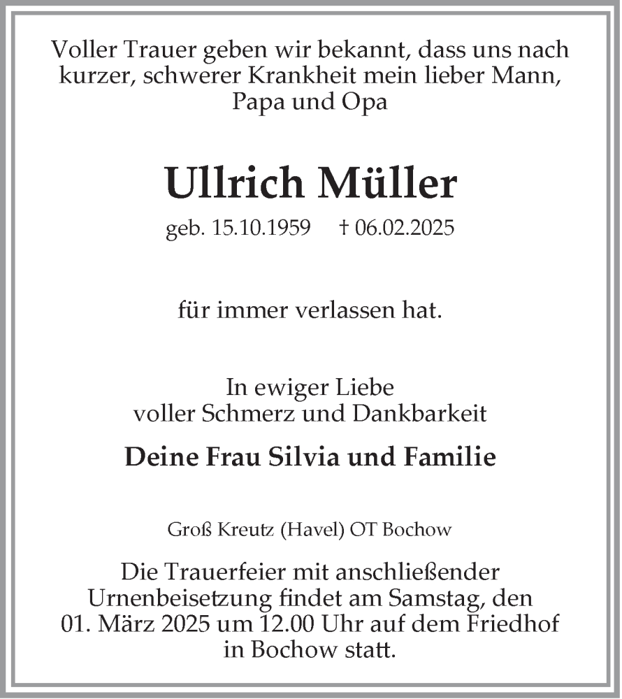 Hier finden Sie alle Traueranzeigen aus der Zeitung, die bisher für Ullrich Müller erschienen sind. Weitere Traueranzeigen, die in der Zeitung erscheinen, werden hier ebenfalls aufgelistet