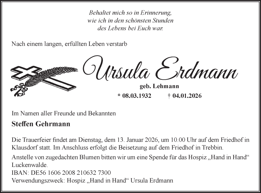 Hier finden Sie alle Traueranzeigen aus der Zeitung, die bisher für Ursula Erdmann erschienen sind. Weitere Traueranzeigen, die in der Zeitung erscheinen, werden hier ebenfalls aufgelistet