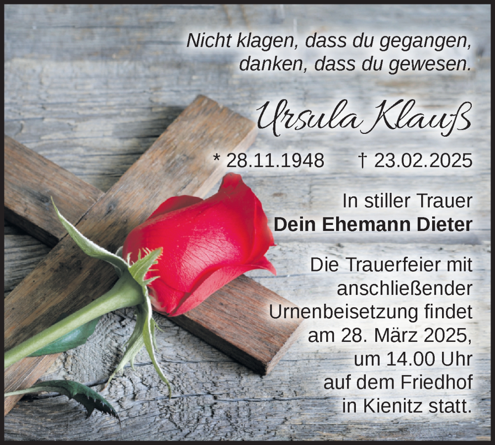 Hier finden Sie alle Traueranzeigen aus der Zeitung, die bisher für Ursula Klauß erschienen sind. Weitere Traueranzeigen, die in der Zeitung erscheinen, werden hier ebenfalls aufgelistet