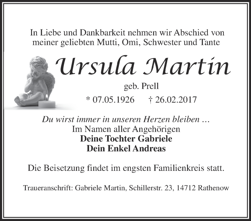 Hier finden Sie alle Traueranzeigen aus der Zeitung, die bisher für Ursula Martin erschienen sind. Weitere Traueranzeigen, die in der Zeitung erscheinen, werden hier ebenfalls aufgelistet