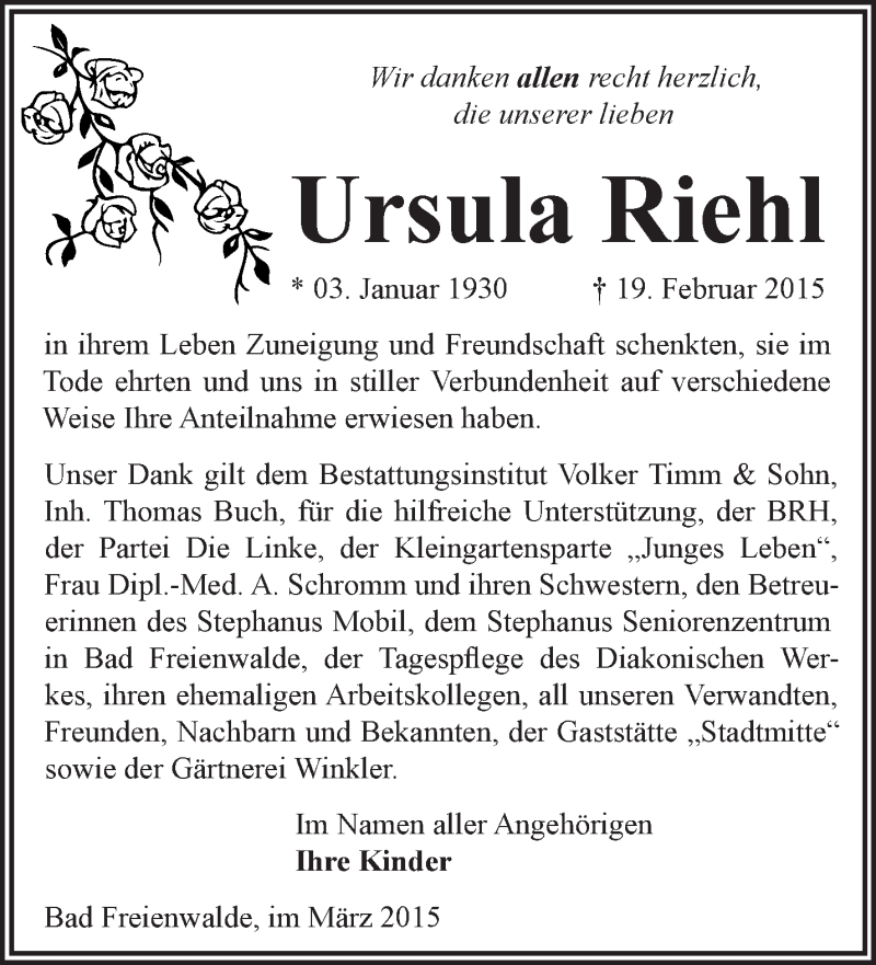 Hier finden Sie alle Traueranzeigen aus der Zeitung, die bisher für Ursula Riehl erschienen sind. Weitere Traueranzeigen, die in der Zeitung erscheinen, werden hier ebenfalls aufgelistet