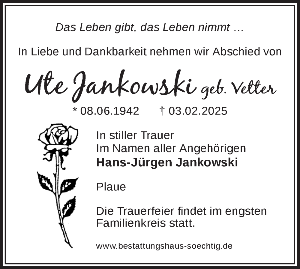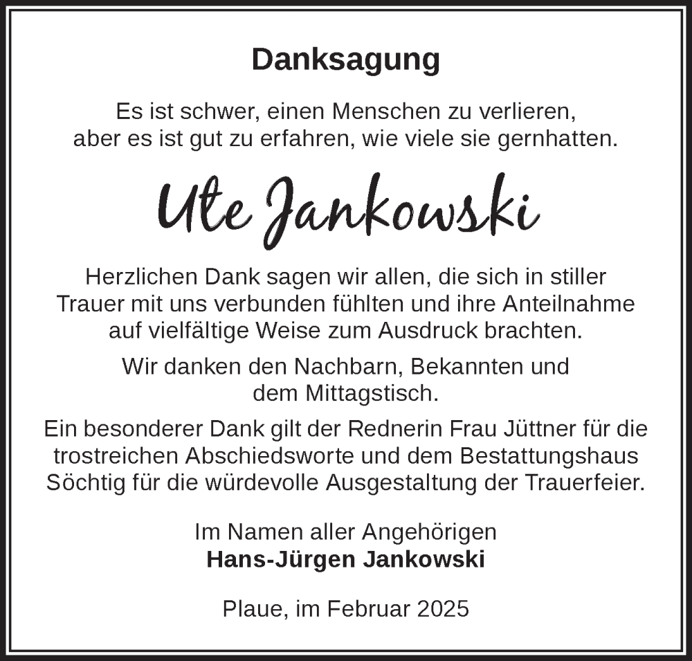 Hier finden Sie alle Traueranzeigen aus der Zeitung, die bisher für Ute Jankowski erschienen sind. Weitere Traueranzeigen, die in der Zeitung erscheinen, werden hier ebenfalls aufgelistet