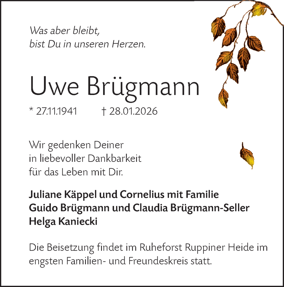 Hier finden Sie alle Traueranzeigen aus der Zeitung, die bisher für Uwe Brügmann erschienen sind. Weitere Traueranzeigen, die in der Zeitung erscheinen, werden hier ebenfalls aufgelistet