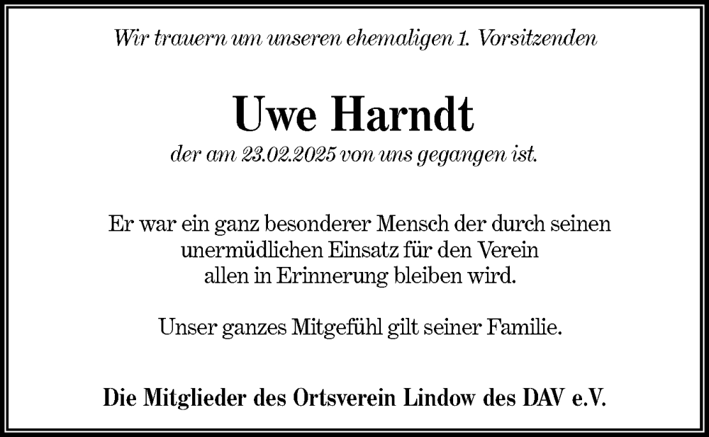 Hier finden Sie alle Traueranzeigen aus der Zeitung, die bisher für Uwe Harndt erschienen sind. Weitere Traueranzeigen, die in der Zeitung erscheinen, werden hier ebenfalls aufgelistet