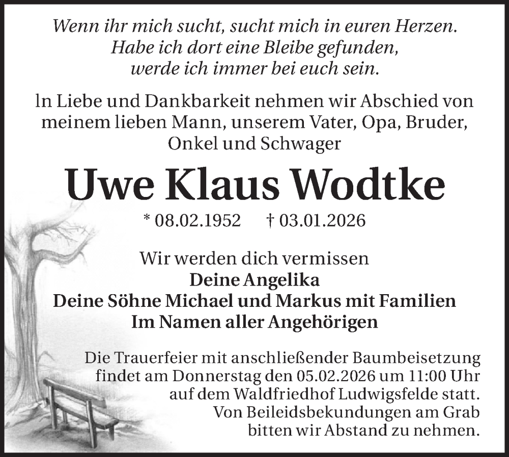 Hier finden Sie alle Traueranzeigen aus der Zeitung, die bisher für Uwe Klaus Wodtke erschienen sind. Weitere Traueranzeigen, die in der Zeitung erscheinen, werden hier ebenfalls aufgelistet