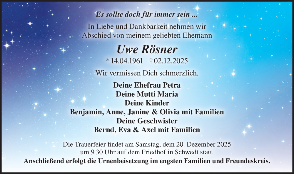 Hier finden Sie alle Traueranzeigen aus der Zeitung, die bisher für Uwe Rösner erschienen sind. Weitere Traueranzeigen, die in der Zeitung erscheinen, werden hier ebenfalls aufgelistet
