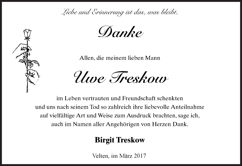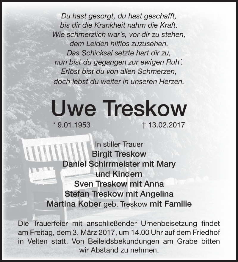 Hier finden Sie alle Traueranzeigen aus der Zeitung, die bisher für Uwe Treskow erschienen sind. Weitere Traueranzeigen, die in der Zeitung erscheinen, werden hier ebenfalls aufgelistet