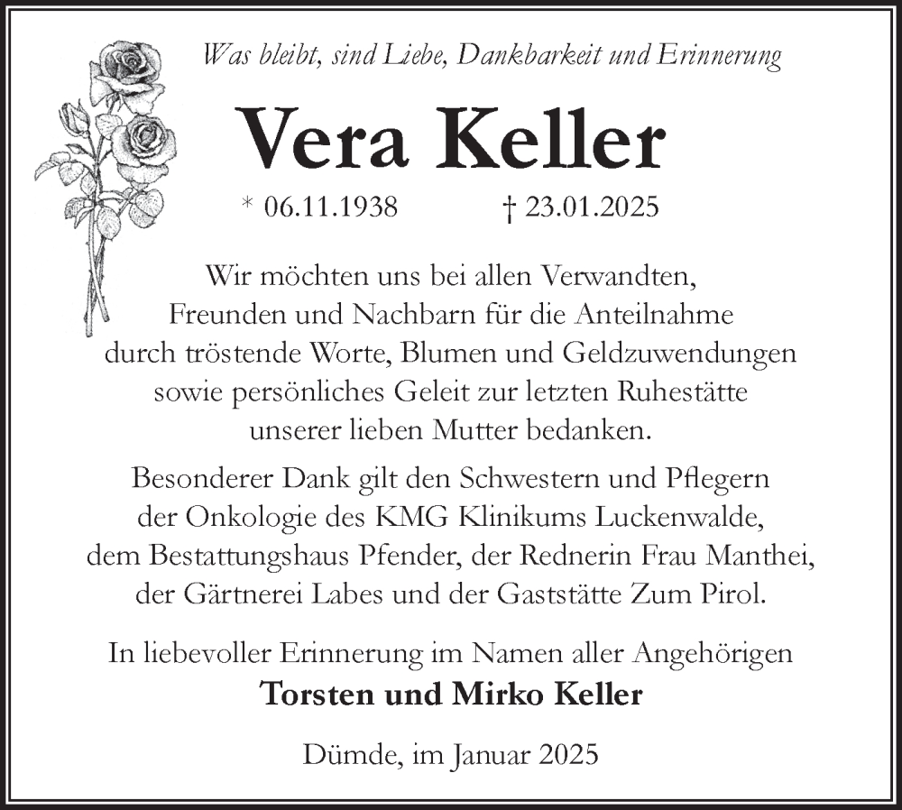 Hier finden Sie alle Traueranzeigen aus der Zeitung, die bisher für Vera Keller erschienen sind. Weitere Traueranzeigen, die in der Zeitung erscheinen, werden hier ebenfalls aufgelistet