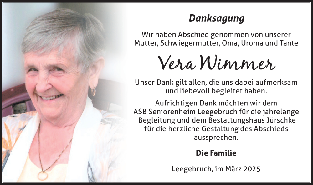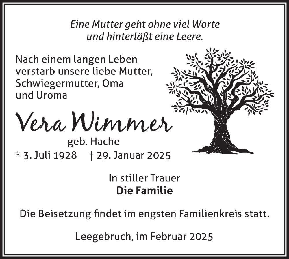 Hier finden Sie alle Traueranzeigen aus der Zeitung, die bisher für Vera Wimmer erschienen sind. Weitere Traueranzeigen, die in der Zeitung erscheinen, werden hier ebenfalls aufgelistet
