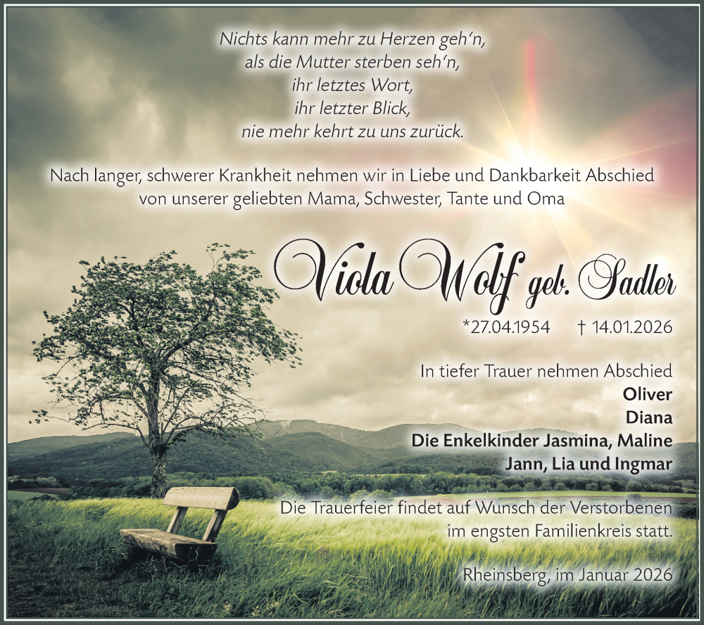 Hier finden Sie alle Traueranzeigen aus der Zeitung, die bisher für Viola Wolf erschienen sind. Weitere Traueranzeigen, die in der Zeitung erscheinen, werden hier ebenfalls aufgelistet