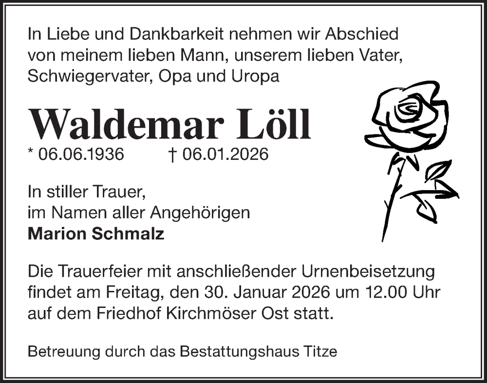 Hier finden Sie alle Traueranzeigen aus der Zeitung, die bisher für Waldemar Löll erschienen sind. Weitere Traueranzeigen, die in der Zeitung erscheinen, werden hier ebenfalls aufgelistet