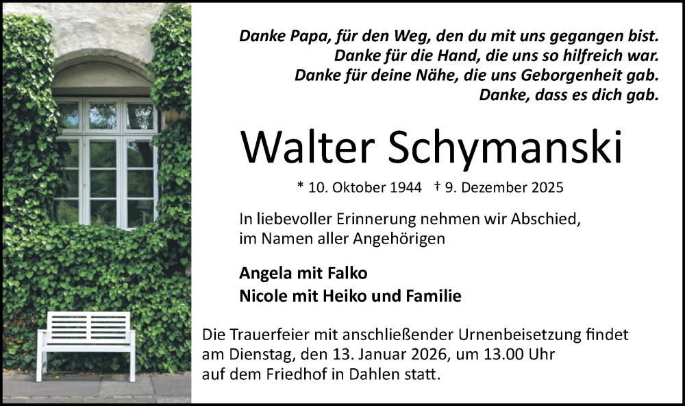 Hier finden Sie alle Traueranzeigen aus der Zeitung, die bisher für Walter Schymanski erschienen sind. Weitere Traueranzeigen, die in der Zeitung erscheinen, werden hier ebenfalls aufgelistet
