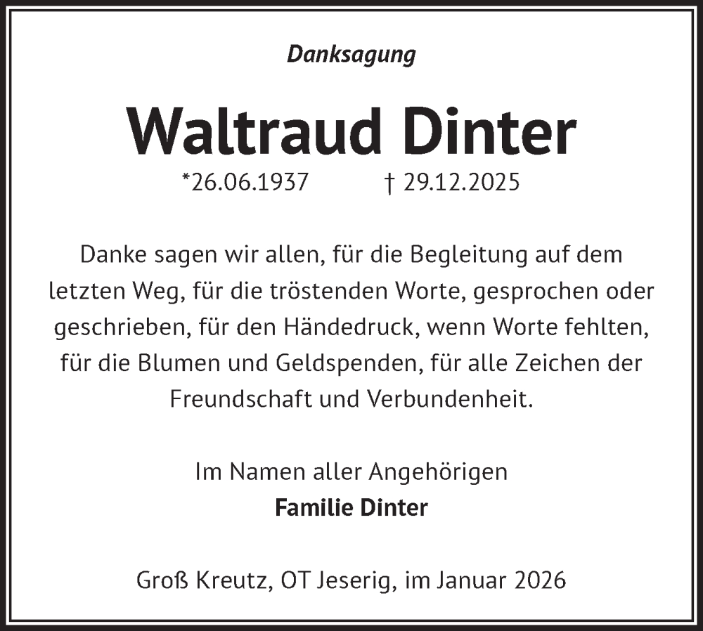 Hier finden Sie alle Traueranzeigen aus der Zeitung, die bisher für Waltraud Dinter erschienen sind. Weitere Traueranzeigen, die in der Zeitung erscheinen, werden hier ebenfalls aufgelistet