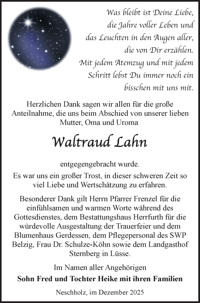 Hier finden Sie alle Traueranzeigen aus der Zeitung, die bisher für Waltraud Lahn erschienen sind. Weitere Traueranzeigen, die in der Zeitung erscheinen, werden hier ebenfalls aufgelistet