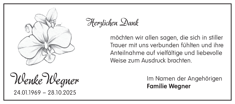 Hier finden Sie alle Traueranzeigen aus der Zeitung, die bisher für Wenke Wegner erschienen sind. Weitere Traueranzeigen, die in der Zeitung erscheinen, werden hier ebenfalls aufgelistet