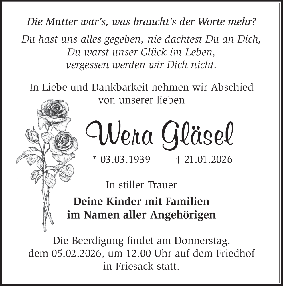 Hier finden Sie alle Traueranzeigen aus der Zeitung, die bisher für Wera Gläsel erschienen sind. Weitere Traueranzeigen, die in der Zeitung erscheinen, werden hier ebenfalls aufgelistet