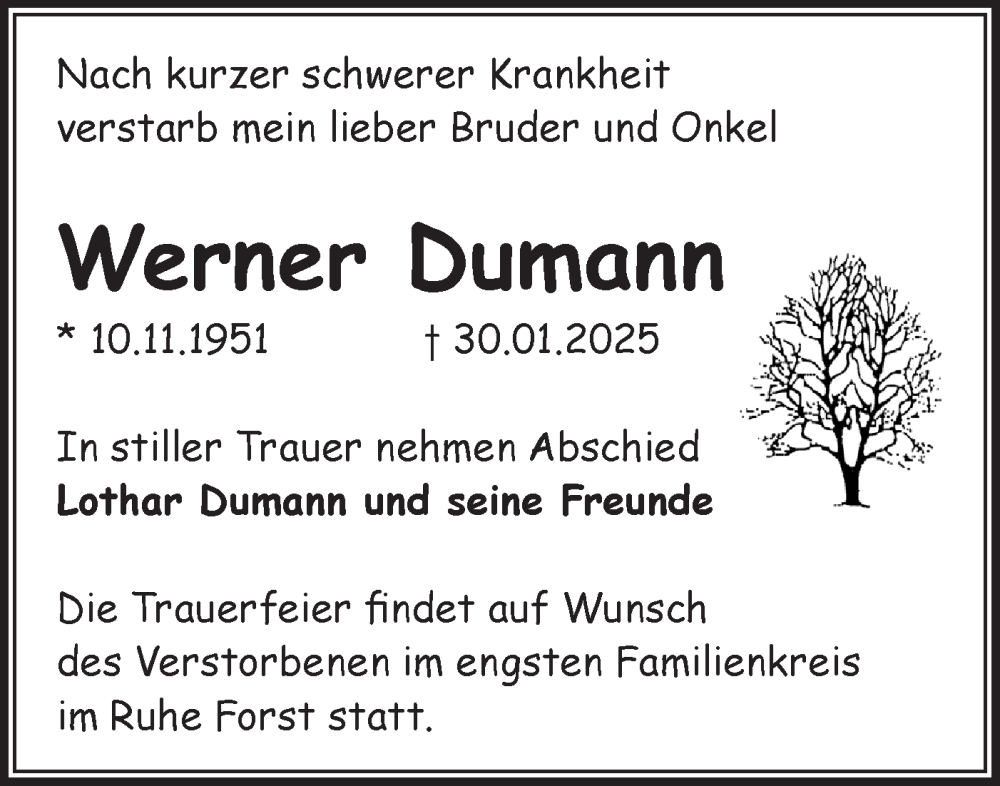 Hier finden Sie alle Traueranzeigen aus der Zeitung, die bisher für Werner Dumann erschienen sind. Weitere Traueranzeigen, die in der Zeitung erscheinen, werden hier ebenfalls aufgelistet