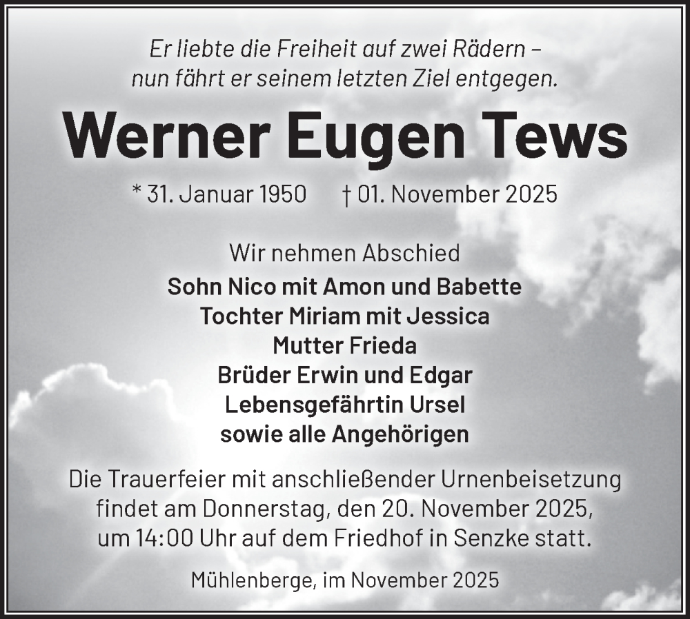 Hier finden Sie alle Traueranzeigen aus der Zeitung, die bisher für Werner Eugen Tews erschienen sind. Weitere Traueranzeigen, die in der Zeitung erscheinen, werden hier ebenfalls aufgelistet