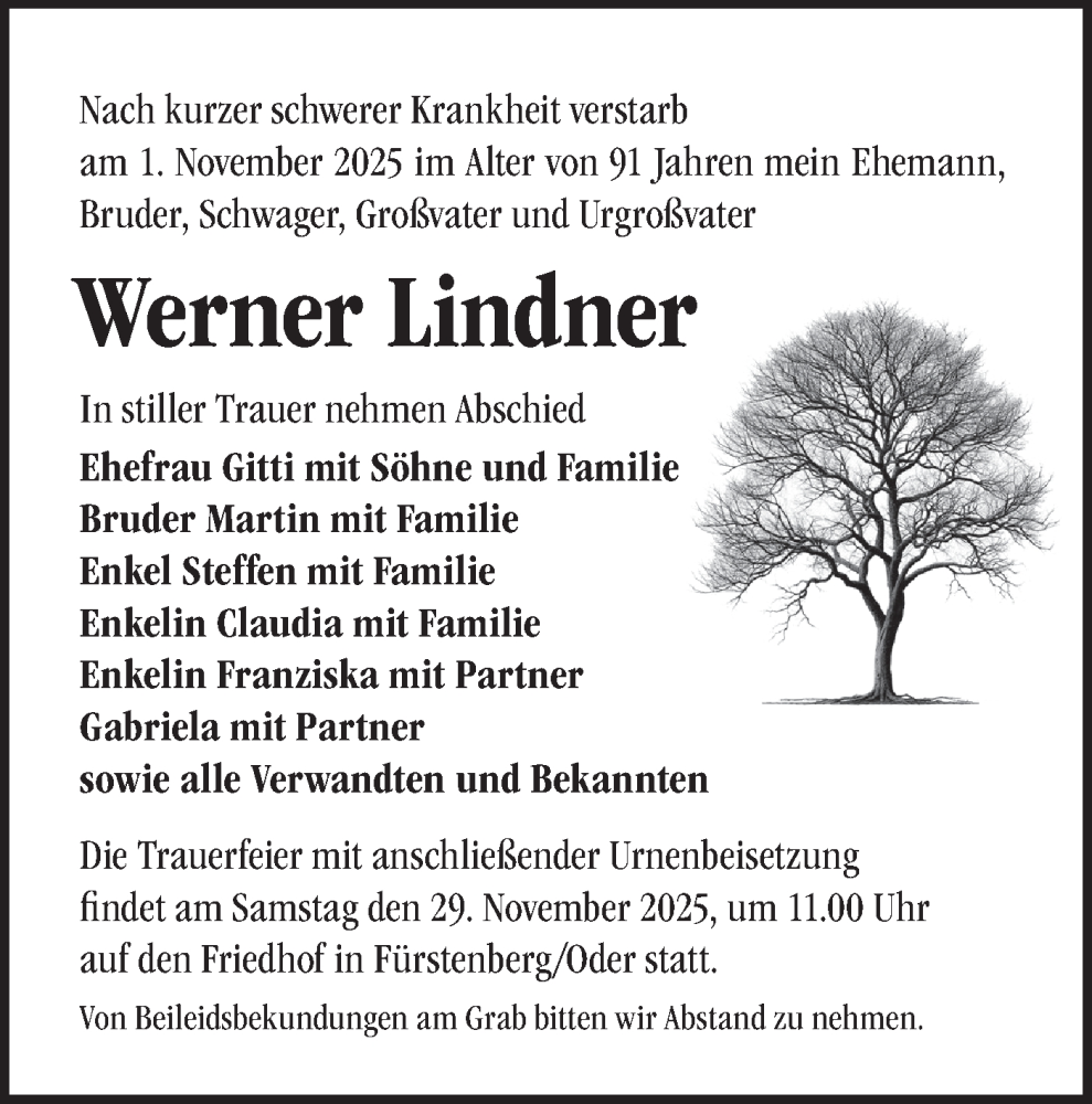 Hier finden Sie alle Traueranzeigen aus der Zeitung, die bisher für Werner Lindner erschienen sind. Weitere Traueranzeigen, die in der Zeitung erscheinen, werden hier ebenfalls aufgelistet