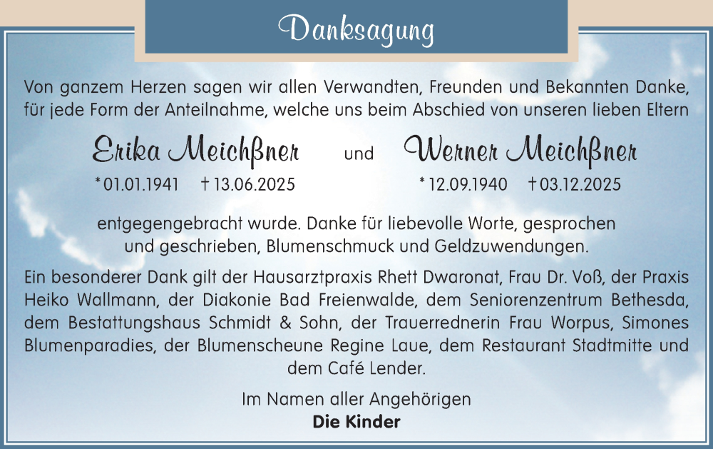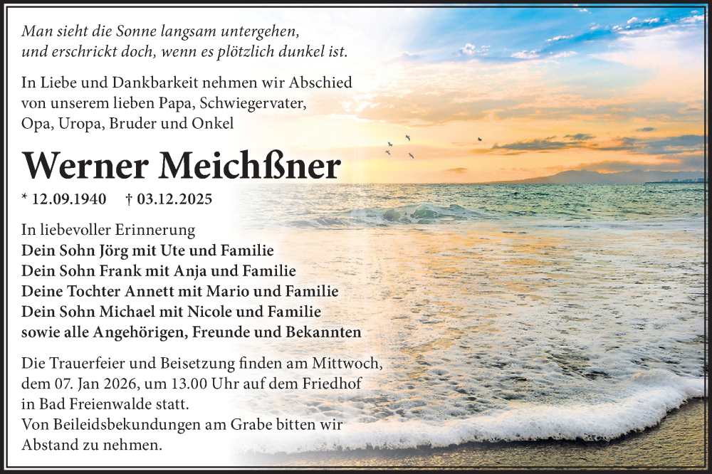 Hier finden Sie alle Traueranzeigen aus der Zeitung, die bisher für Werner Meichßner erschienen sind. Weitere Traueranzeigen, die in der Zeitung erscheinen, werden hier ebenfalls aufgelistet