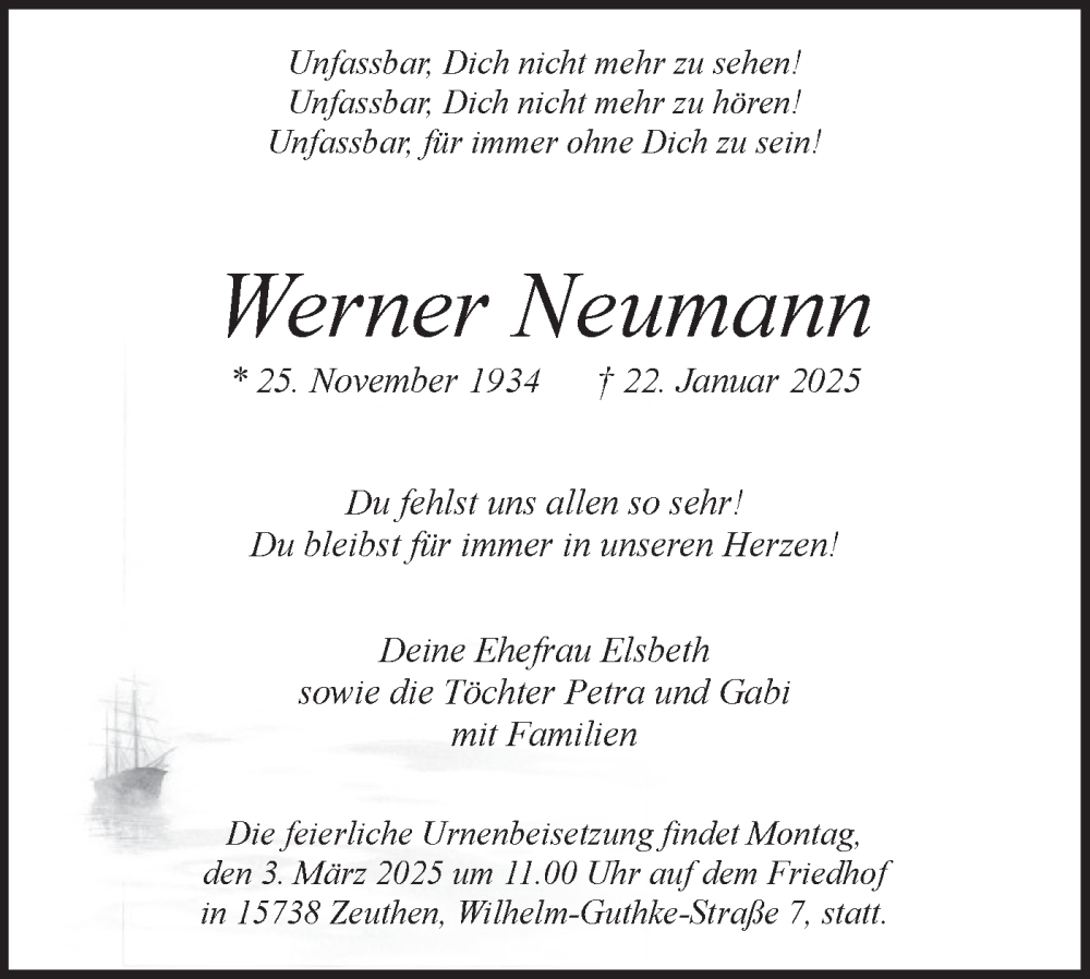 Hier finden Sie alle Traueranzeigen aus der Zeitung, die bisher für Werner Neumann erschienen sind. Weitere Traueranzeigen, die in der Zeitung erscheinen, werden hier ebenfalls aufgelistet