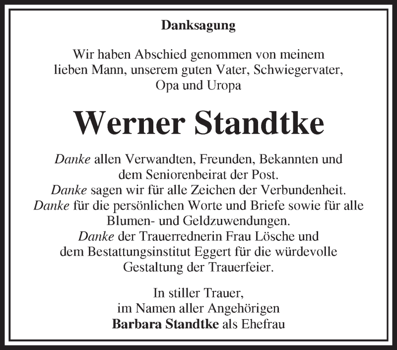 Hier finden Sie alle Traueranzeigen aus der Zeitung, die bisher für Werner Standtke erschienen sind. Weitere Traueranzeigen, die in der Zeitung erscheinen, werden hier ebenfalls aufgelistet