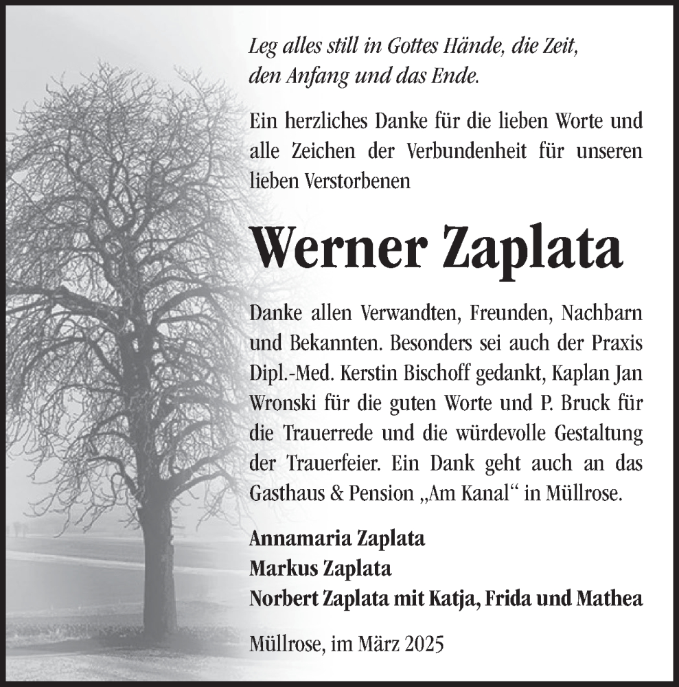 Hier finden Sie alle Traueranzeigen aus der Zeitung, die bisher für Werner Zaplata erschienen sind. Weitere Traueranzeigen, die in der Zeitung erscheinen, werden hier ebenfalls aufgelistet